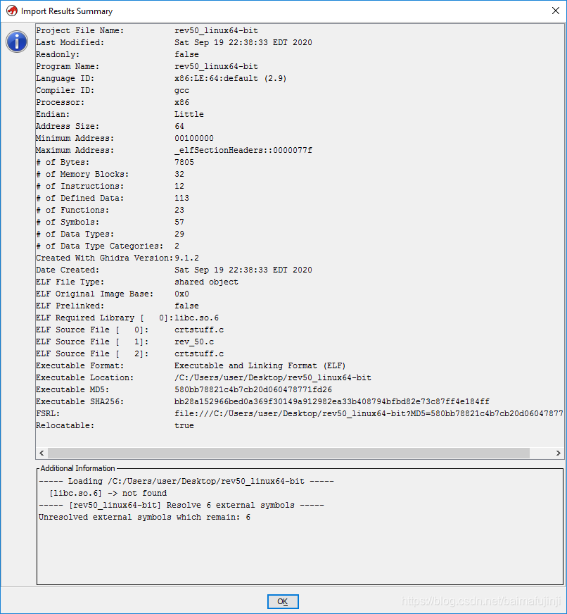文件解析完成后,弹出的对话框里(如下图所示)给出了一些总结信息,你可以看到例如程序中包含了23个函数这样的内容。在附加信息栏中给出了例如libc.so.6这样的shared library没有找到,以及有些内容无法解析等提示。就目前这个项目而已,这些内容不会有什么影响,所以直接点击【OK】按钮。