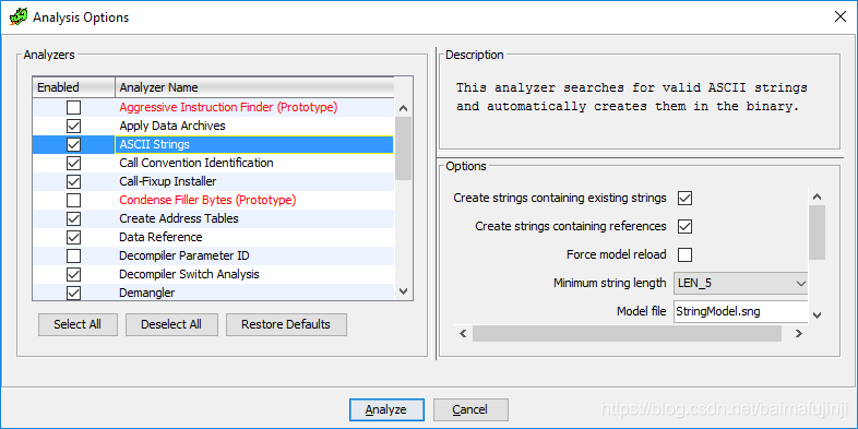 Analysis Options对话框给出的是需要分析的条目,例如在ASCII Strings中,你可以设置最小的字符串长度等选项。大部分选项,只要保持默认设置即可。为了便于后续分析,此处我们将Decompiler Parameter ID勾选。最后,单击【Analyze】按钮,Ghidra主界面右下角给出了分析进度,快慢视程序大小、是否加壳等而定。当前程序较小,所以很快便得到了结果。