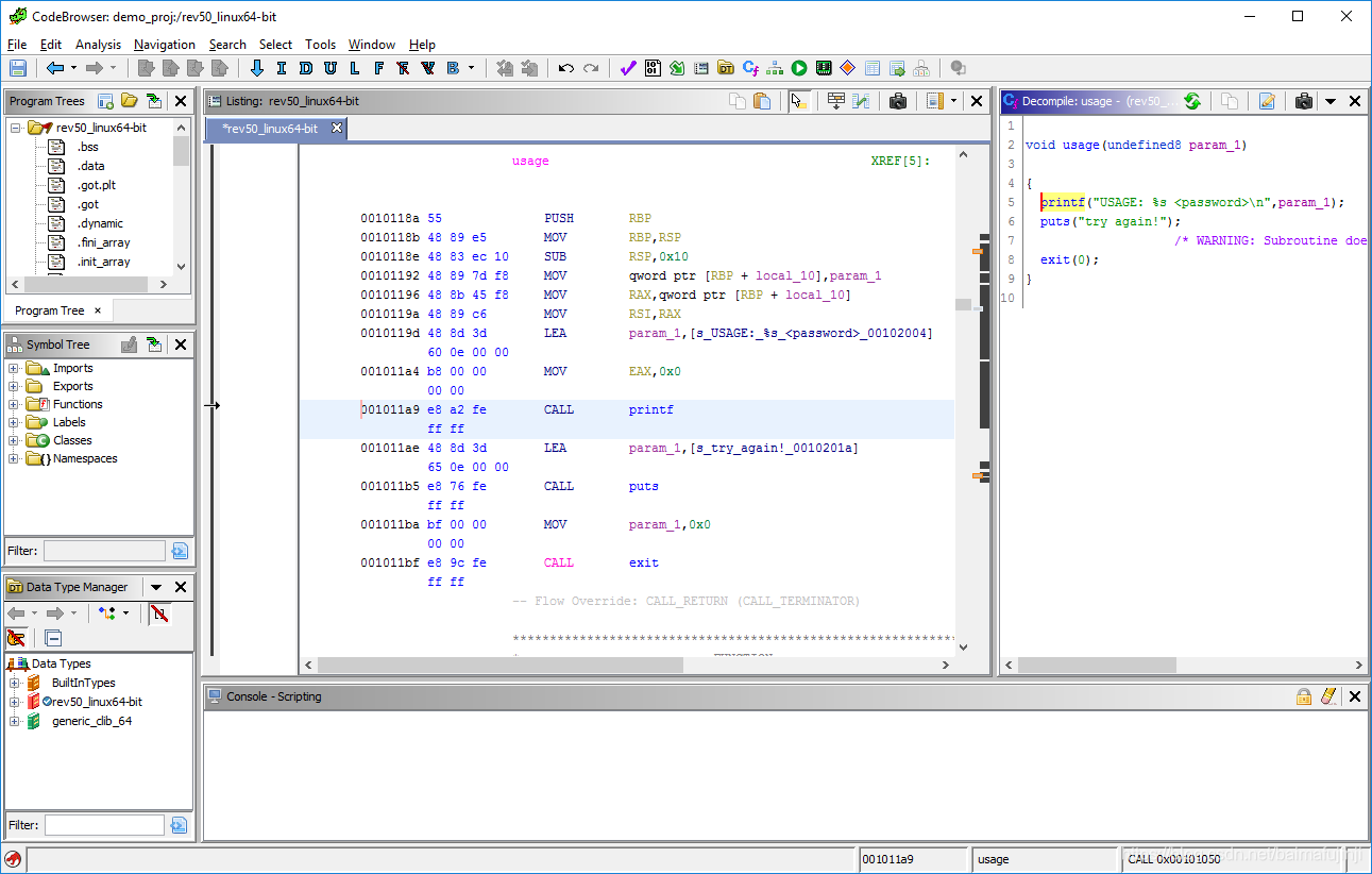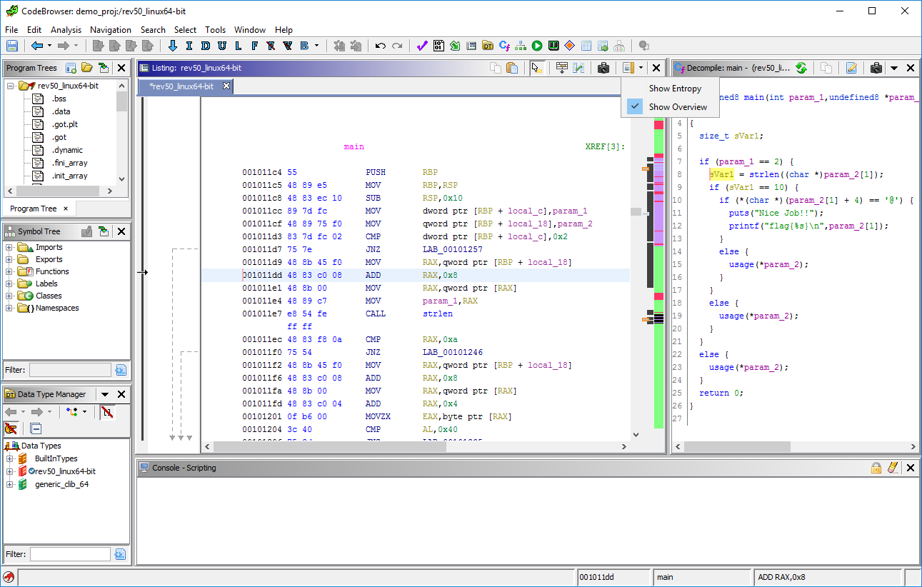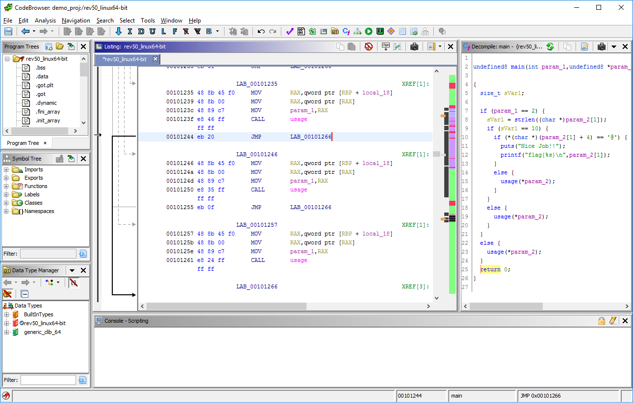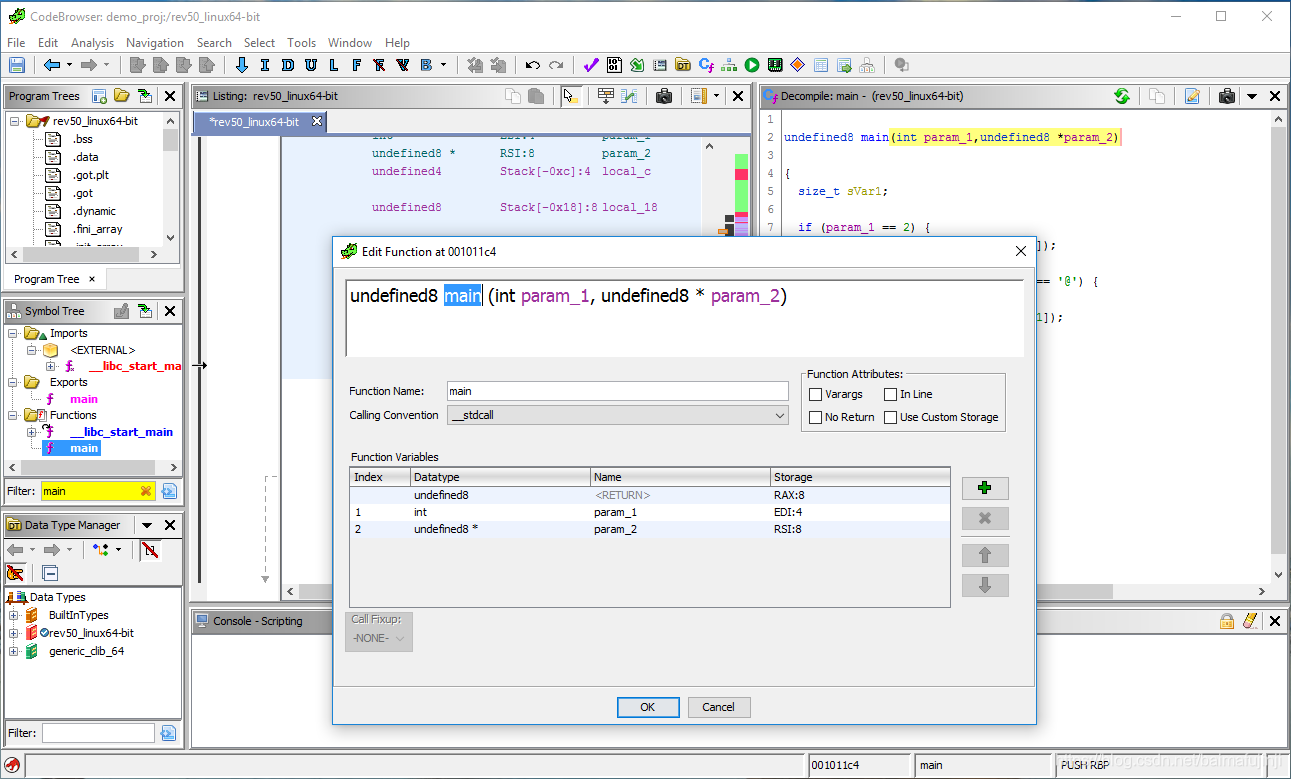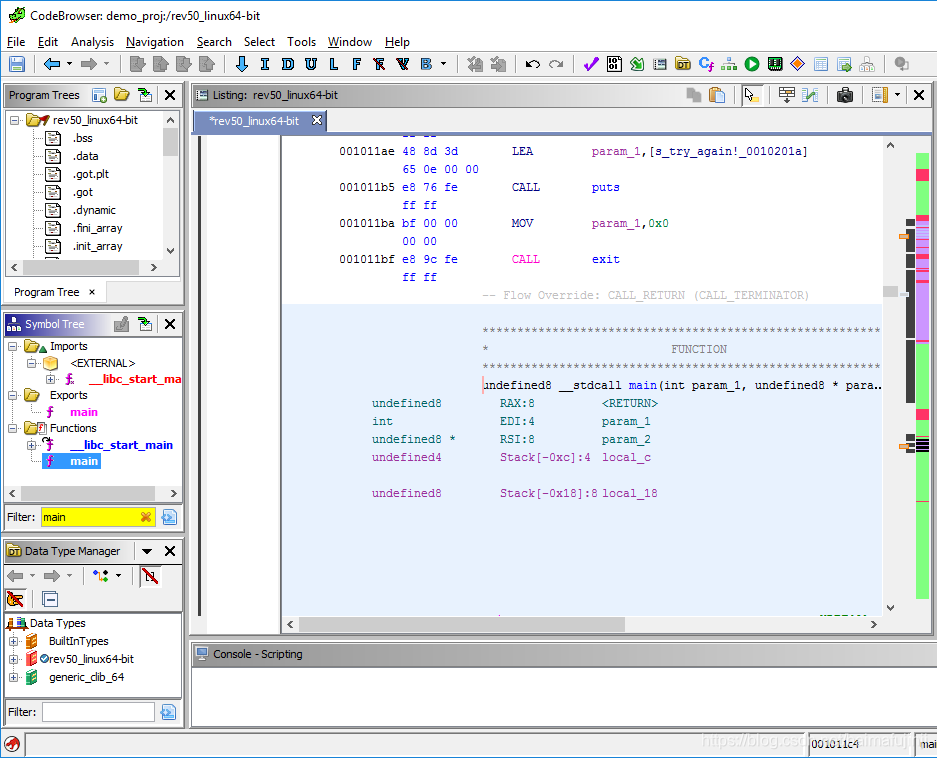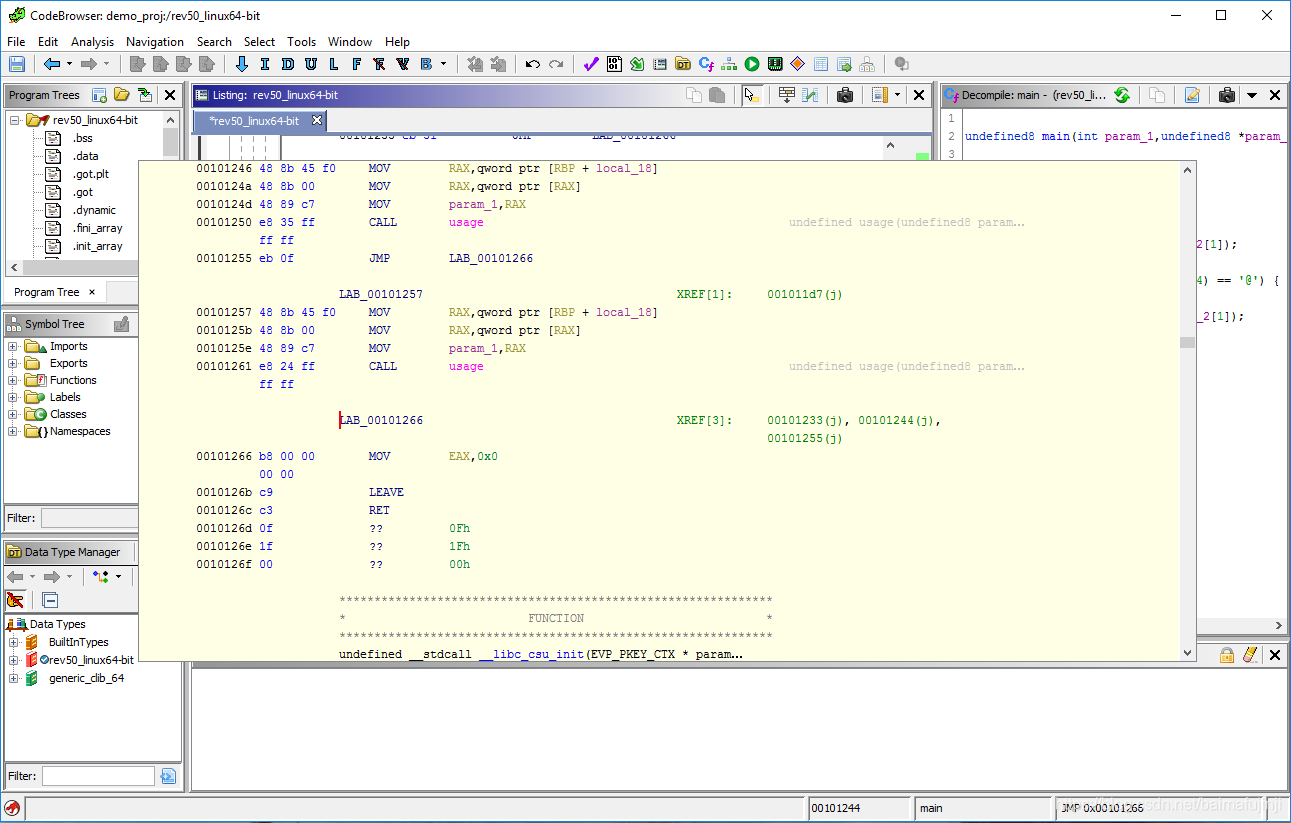 下面正式开始对rev50程序进行逆向。首先,如下图所示,为了找到程序的入口,在Symbol Tree窗口上的Filter栏目里搜索main,然后在得到的结果中点击main,这样Code Browser中的代码就跳转到了主函数处。