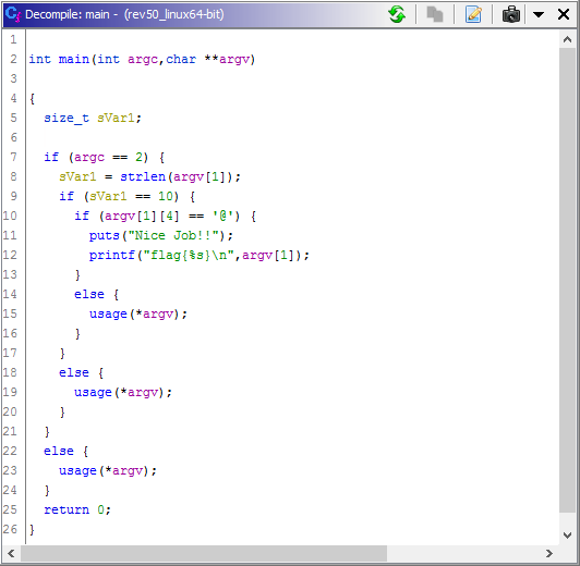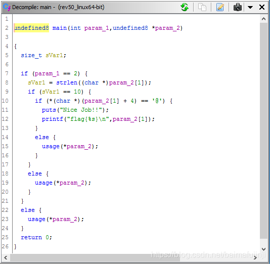 点击【OK】按钮后,不难发现main函数的变量名已经被自动替换了。现在这个函数的意思其实已经比较好理解了。根据C语言main函数的声明的意义,易知argc表示命令行接收参数的个数。下面程序要首先验证argc是否等于2,注意,这里2的意思表示程序的参数只有1个,因为程序名本身也算一个参数。也就是说后面的参数列表argv中,argv[1]就表示传进来的那个参数(argv[0]就是程序名称本身)。接下来,程序取得字符串argv[1]的长度,判断其是否等于10,并且判断其中索引为4的字符是否等于@。至此,大概已经可以猜到,这其实就是程序密钥的形式。