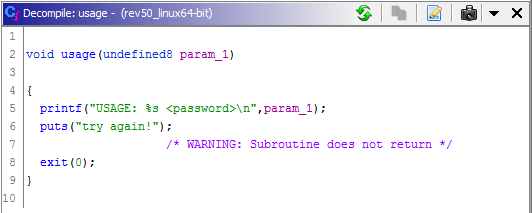 如果想要再确定一下的话,可以点击查看usage函数(也就是条件不满足时的处理函数)的内容,如下所示。可见,这是密钥不正确时程序的处理函数,因为它会输出“Try again!”字样。这也再次令我们确认,可以通过测试的密钥形式了。