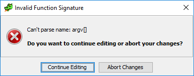 如果点击【OK】按钮的话,Ghidra弹出了如下所示的错误提示。注意Ghidra给出的反汇编结果仅仅是一种类似C的伪代码,这与纯粹意义上的C语言代码是不同的,所以同理Ghidra也不能完全理解此处的函数声明中用到的C语法。它不会把 [ ] 看成是一种数组标记,而是把 argv[ ] 整体看成是一个变量名,这也就是下面这个错误提示的由来。