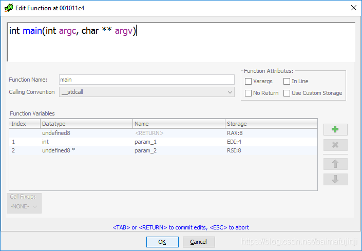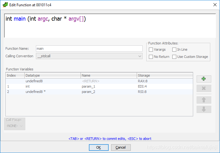 但C语言main函数的定义方式是有一定标准的,而且这个标准我们是已知的,即int main(int argc, char * argv[])。于是,想到把这个信息导入Ghidra,具体方法是在反编译窗口中右键单击main函数,然后从右键菜单中选择Edit Function Signature,程序会弹出如下所示的新对话框:
