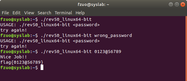 最后来验证一下我们的猜测,注意rev50是一个ELF文件,也就是Linux下的可执行文件,所以下面的测试是在Ubuntu上执行的。可见此前的推断是完全正确的,我们已经成功破解了crackmes上的easy_reverse问题。