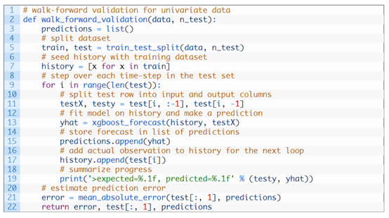 然后它遍历测试集,调用xgboost_forecast()函数做一步长的预测。计算错误度量并返回详细信息以供分析。