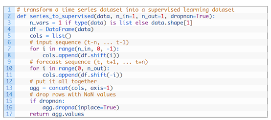 下面的函数将时间序列作为具有一列或多列的NumPy数组时间序列,并将其转换为具有指定数量的输入和输出的监督学习问题。
