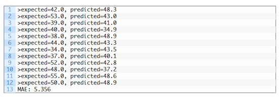 print('>expected=%.1f,predicted=%.1f' % (testy, yhat))