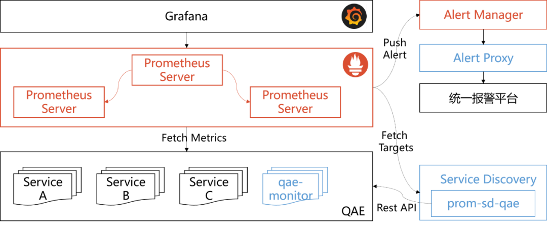 QAE平台自身内建了监控功能,包括容器级和应用级两个层级,除了可以在QAE平台通过页面查看,也支持通过HTTP接口暴露出监控数据,这就为我们进行统一的监控数据采集提供了可能。