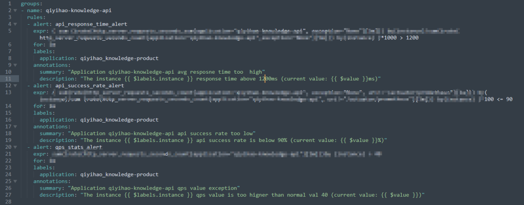 在配置报警规则时,我们将每个服务的报警规则定义在一个group下,每个group定义了多条报警规则,包括:响应时间报警、接口成功率报警、QPS报警、第三方接口报警等。这样的好处是以服务为维度将报警规则聚合在一起,查看和配置时更方便;另外,同一个报警规则下不同服务的报警阈值可能不同,这样也可以独立配置。下图是一个报警规则示例: