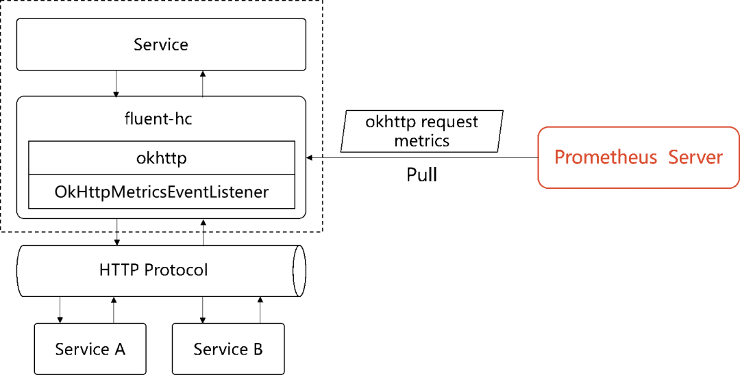 具体而言,Micrometer提供了OkHttpMetricsEventListener组件,用于收集Okhttp的监控数据。我们只需要在构建Okhttp实例的时候传入OkHttpMetricsEventListener实例即可;也可以传入一个EventListener.Factory实例,在工厂的创建方法中返回OkHttpMetricsEventListener实例。Okhttp在3.11.0的版本中才正式加入了EventListener功能,使用时需要注意Okhttp的版本。