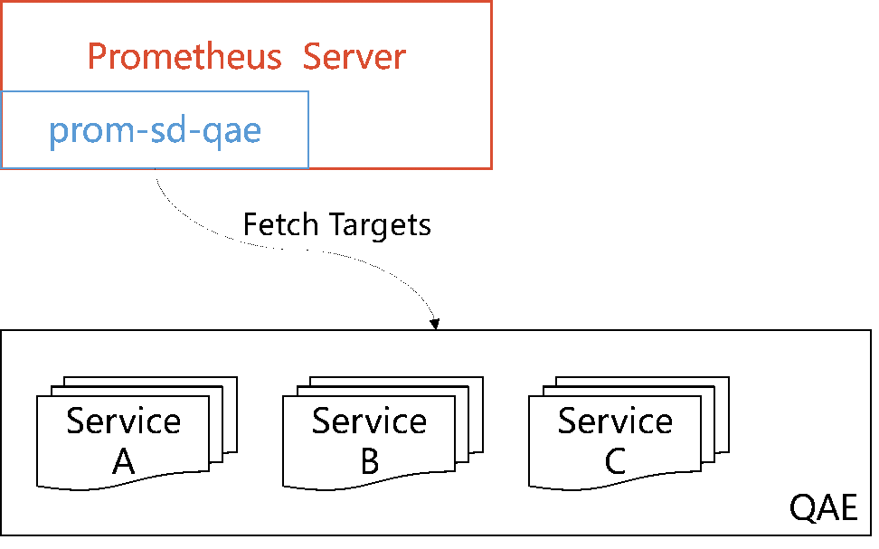 Prometheus服务发现的原理很简单,通过第三方提供的接口,Prometheus查询到需要监控的目标列表,然后轮训监控目标获取监控数据。由于QAE是私有云平台,Prometheus无法直接提供支持,但基于以上原理,我们可以实现类似的服务发现机制。