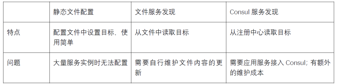 静态配置的方式最为简单,但在实际生产环境中并不可取。容器每时每刻都可能进行着创建和销毁,不可能通过静态配置方式设置监控目标。我们最开始选择了Consul的服务发现,它引入了集中的注册中心,微服务启动时向注册中心注册服务实例,Prometheus便可以从注册中心查询到服务实例作为监控目标。不过,我们最终并没有采用Consul,主要原因有两点,一是微服务接入Consul需要涉及代码改动,虽然改动不大,但大量服务的接入仍有不小的成本;二是还需要再单独部署和维护一套Consul环境,带来新的维护成本。