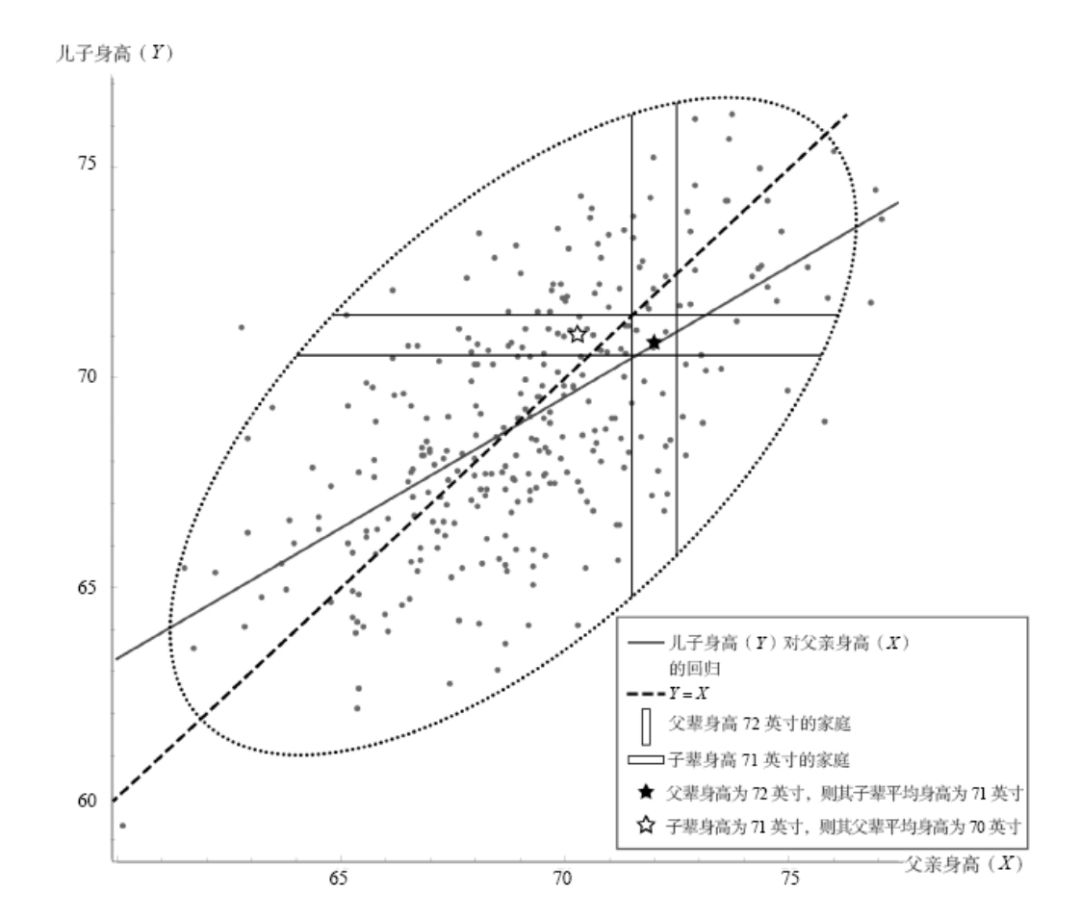[5] 女性的身高一般低于男性,因此高尔顿利用计算出的男女平均身高之比(1.08)将女性的身高乘以1.08换算成男性身高。高尔顿据此定义了“中亲”(mid-parents)身高=1/2(父亲的身高+1.08×母亲的身高),用来计算父辈的身高。本书为了讲述方便,将之简化为父子身高。——译者注