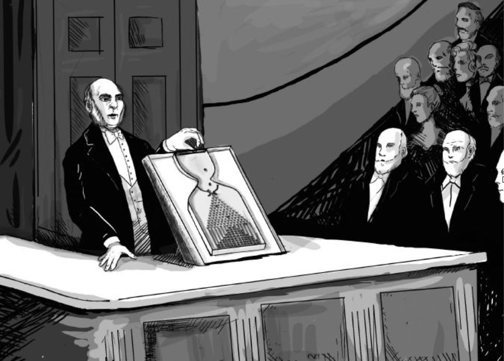 弗朗西斯·高尔顿爵士在皇家学院展示他的“高尔顿板”(Galton board)或称“梅花机”(quincunx)。