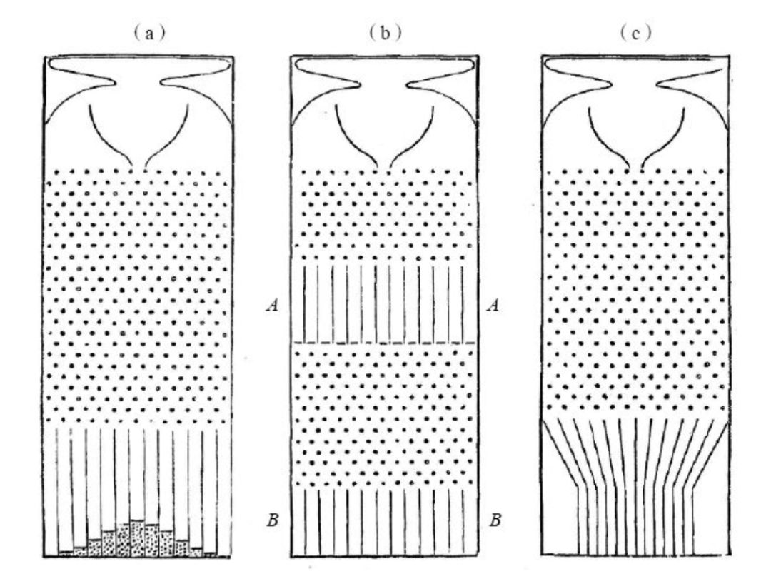 图2.1 高尔顿板,弗朗西斯·高尔顿用以类比人类的身高遗传规律。(a)将许多小球扔进弹球仪器,随机向下弹跳的小球堆积成钟形曲线。(b)高尔顿指出,经过A和B两个通道,通过两层的高尔顿板(用以模拟两代人)下落的小球所堆积成的钟形曲线会变得更宽。(c)为了抵消这种曲线变宽的趋势,他安装了斜槽,以使“第二代”小球回到中心。斜槽是高尔顿对“向均值回归”这一现象的因果解释(资料来源:弗朗西斯·高尔顿《自然遗传》,1889)