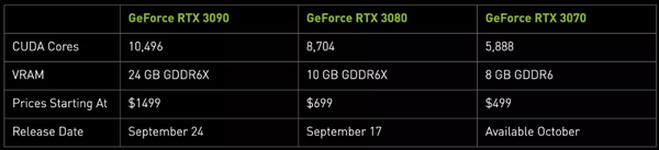 这款显卡更类似于 Titan 系列,比上一代「正常范围内」的最高级显卡 GeForce RTX 2080 Ti 的性能要强大许多。RTX 3090 将于 9 月 24 日上市,起始价为 1499 美元。如果说没有传说中 40G 显存的新泰坦,它就是旗舰 GPU 了。