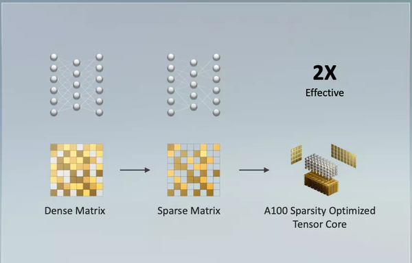 除了制程提高,安培架构还有一些针对 AI 计算特有的机制,其中的三代 Tensor Core 会对稀疏张量运算进行特别加速:执行速度提高一倍,也支持 TF32、FP16、BFLOAT16、INT8 和 INT4 等精度的加速——系统会自动将数据转为 TF32 格式加速运算,现在你无需修改任何代码量化了,直接自动训练即可。