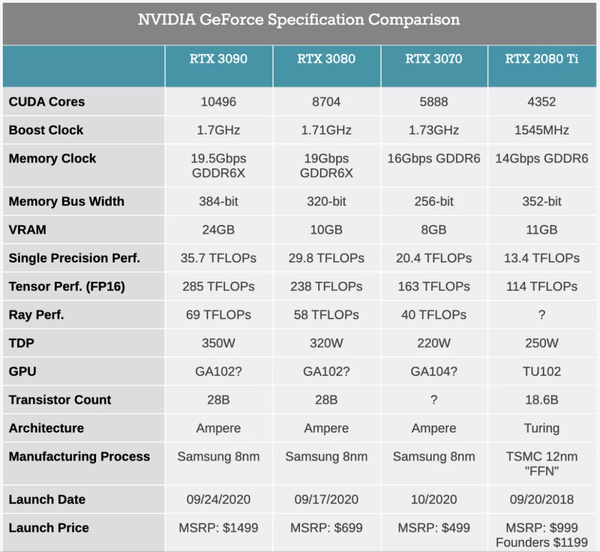 可以看到,RTX 3090 和 RTX 3080 显存容量差距较大,这或许是在为稍后推出的 RTX 3080 Super 留位置。另外,3090 的 24G 内存和 1399 美元的价格或许能够让很多对深度学习有需求的用户省下买泰坦的预算。如果你真的想要「Titan Ampere」,预计它会是一个显存 40G,售价 3000 美元的夸张显卡。