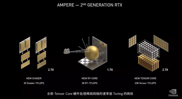 黄仁勋表示,GeForce RTX 30 系列显卡具备三项基础处理技术:30TFLOPS 算力的可编程着色器(Turing 架构是 11),双倍吞吐量,用于光追的 RT Core(58 RT TFLOPS,Turing 架构是 34),以及可自动忽略次要 DNN 权重的 Tensor Core(238Tensor TFLOPS,旧版为 89)。
