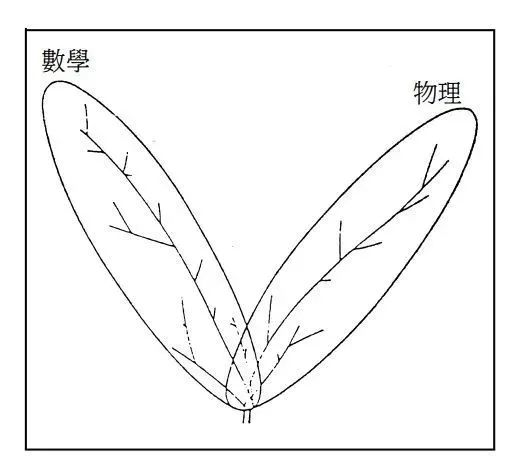 不过,擅长使用数学于物理的杨振宁教授却认二者间的差别很大。他有一个生动的“双叶”比喻,来说明数学和物理学之间的关系(如下图)。他认为数学和物理学像一对“对生”的树叶,他们只在基部有很小的公共部分,多数部分则是相互分离的。