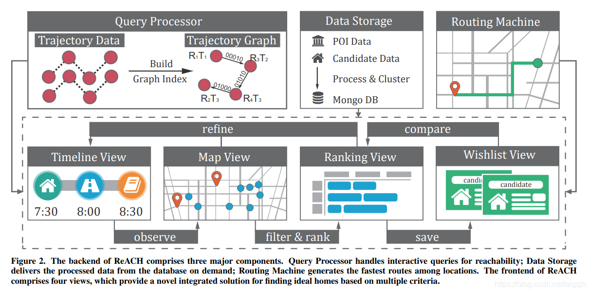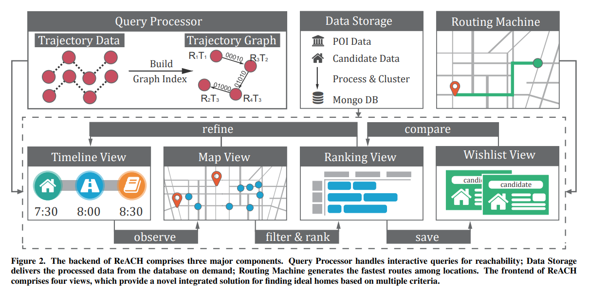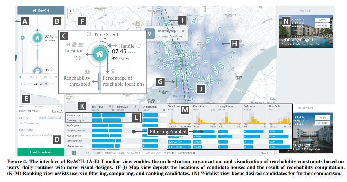 - 设计并开发了一个可视分析系统,称为Reachability-Aided Contemporary HomeFinder(ReACH),以帮助用户交互查询,过滤和评估候选家庭,以确定他们的理想家园。