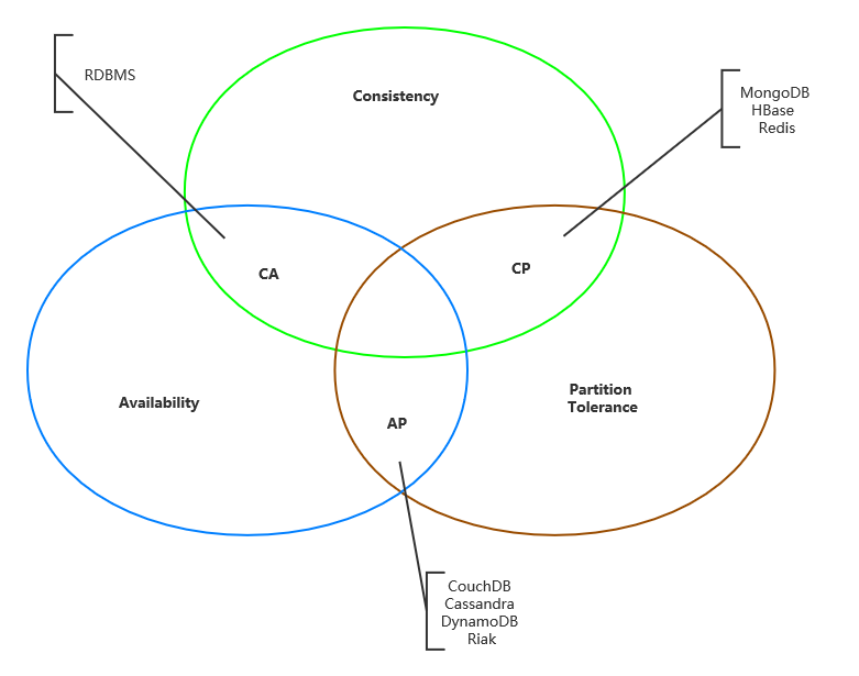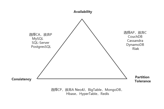 CA:放弃分区容忍性,去成就可用性和一致性。把所有和事务相关的内容都放在一台机器上,避免网络分区。这样就根本不存在网络分区的问题,传统的关系数据库、集中式数据库,例如:Mysql、SQL Server,都是这种原则,因此他们的扩展性非常差。