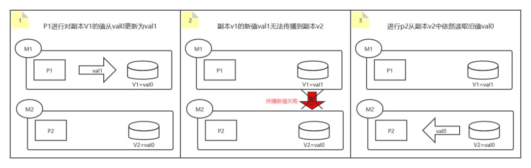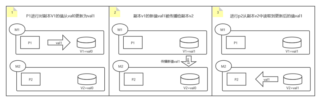 在M1这台机器上有个P1进程对副本V1进行了更新操作(副本V1在M1上,副本V2在M2上,为一个数据的两个副本)。在M1上P1对副本进行了更新,更新要传播到机器M2上面,传播完成之后,进程P2就要从副本V2中把更新读出来。