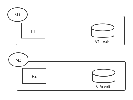假如在网络上有两台机器,M1和M2,两个机器上各跑一个进程,且初始值都是val0。