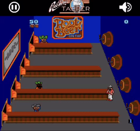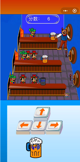 该公司的对接人给了一个这样的小游戏,需要迁移到微信小游戏上,这个游戏的名称叫做Root Beer Tapper。玩法就是一个酒保不断的倒酒,传递给顾客。顾客到达桌子边沿或者酒杯传多了游戏就结束了。另外他们也没有提供什么UI,素材。