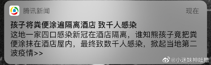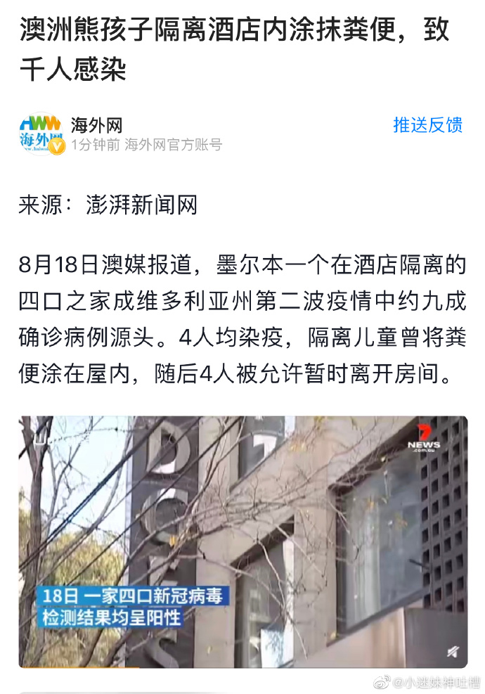 0、【澳大利亚熊孩子酒店抹粪致千人感染新冠】据英国《每日邮报》报道,澳大利亚维多利亚州是该国新冠疫情二次暴发的“重灾区”。近日卫生部门查明,造成这次疫情的最主要原因,与两个“熊孩子”的一个令人震惊的举动有关。维多利亚州卫生部的流行病学家查尔斯·阿尔普伦博士说,5月18日,该酒店曾经发生了一起“环境污染事件”。澳大利亚《先驱太阳报》称,这起事件是上述家庭的两个孩子在隔离期间,将大便涂抹在酒店房间的多个地方,导致房间无法再住人。目前,关于维州二次疫情的调查仍在继续。阿尔普伦博士透露,除了Rydges酒店,墨尔本的另一家酒店斯坦福广场酒店(Stamford Plaza)也暴发了集群感染。数据显示,在过去一个月进行的近1600例基因组检测中发现,99%的病例都与Rydges酒店有关,只有12例是来自Stamford酒店本身。