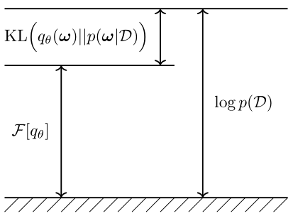 如图所示说明了如何将近似分布和真实后验之间的关系示意图,由此可知通过近似对数似然逼近近似分布与真实分布之间的 KL 散度。
