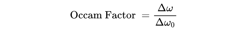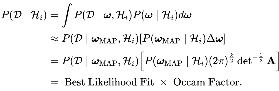 这可以解释一种黎曼近似,具有代表证据峰值的最佳似然拟合,并且 Occam 因子是由高斯峰值周围的曲率表征的宽度。其中 Occam 因子的计算公式为:
