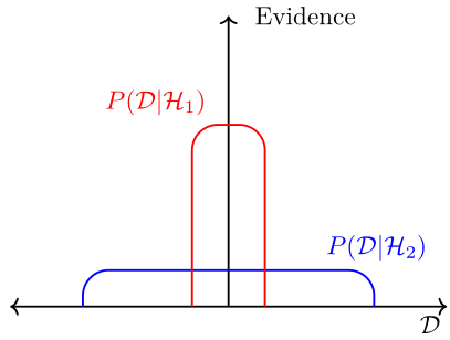 这意味着 Occam 因子是似然参数空间中前后变化的比率。下图以图形方式演示了这个概念。有了这种表示,一个能够表示大范围数据的复杂模型将具有更广泛的证据,从而具有更大的 Occam 因子。