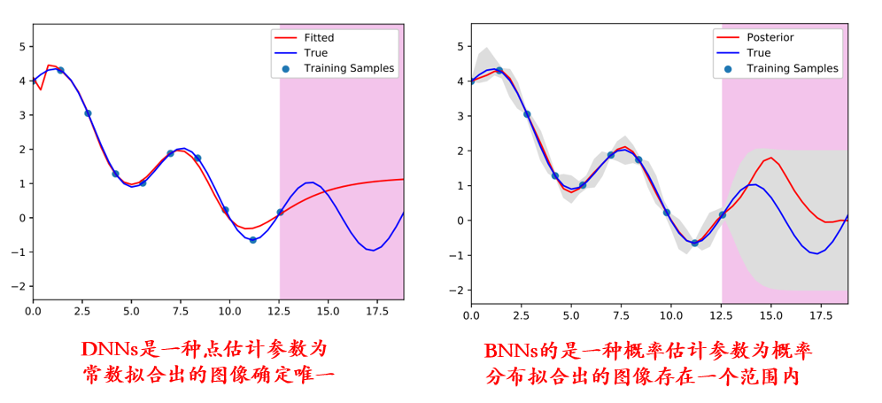 神经网络的输出用来描述特定的概率分布的似然。通过采样或者变分推断来计算后验分布。这对于很多问题来说非常关键,由于 BNN 具有不确定性量化能力,所以具有非常强的鲁棒性。如下图所示为 DNN 和 BNN 的之间的差异: