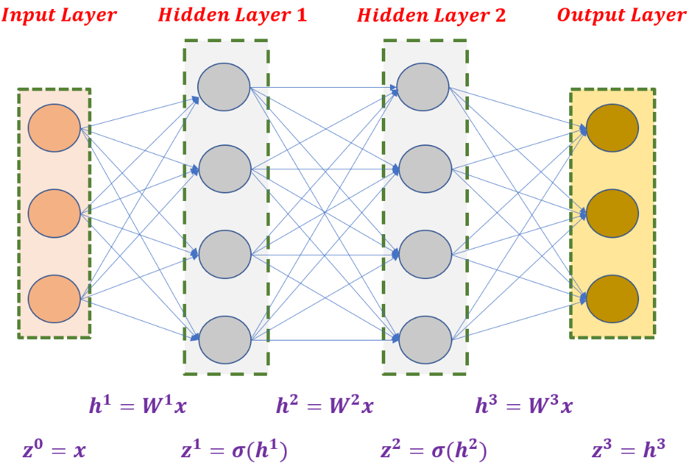 下图为 3 层不考虑偏置项的全连接神经网络示意图: