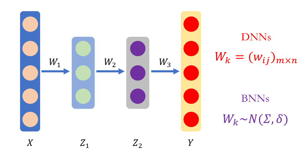 BNN 跟 DNN 的不同之处在于,其权重参数是随机变量,而非确定的值,它是通过概率建模和神经网络结合起来,并能够给出预测结果的置信度。其先验用来描述关键参数,并作为神经网络的输入。