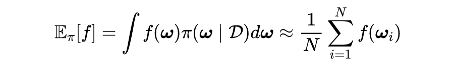 论文中这这部分作者没有详细展开说明,不过可以从公式可以推测出来 表示的是已知训练数据集的情况下,贝叶斯神经网络给出的样本 的预测, 表示是不同权重参数的给出预测的期望,然后用蒙特卡洛模拟将期望形式转化成离散的平均加和的形式。