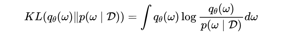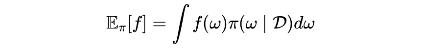 贝叶斯神经网络的重点是寻找良好的后验分布近似值上,预测值和区间都是作为后验 的期望值来计算的,其中精确的预测依赖于对难以处理的后验概率的精确近似。具体的计算公式如下所示: