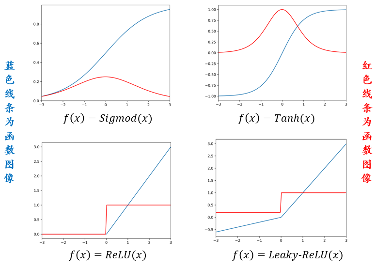 下图为神经网络中常用的激活函数示例,其中蓝色线条为激活函数图像,红色线条为激活函数的导数图像。这些函数分别是 Sigmoid(x),Tanh(x),ReLU(x),Leaky-ReLU(x)。