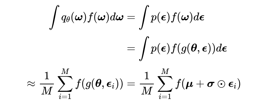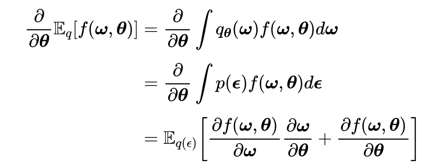 Blundell 等人在论文《Bayes by Backprop》中提出了一种在 BNNs 中进行近似推理的方法。该方法利用重参数化技巧来说明如何找到期望导数的无偏估计。其期望导数的具体形式如下所示: