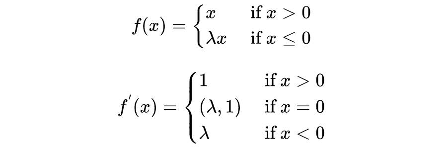 Leak-ReLU 函数是 ReLU 函数的改进版本,定义域为 R,值域为 R,其函数和导数形式为: