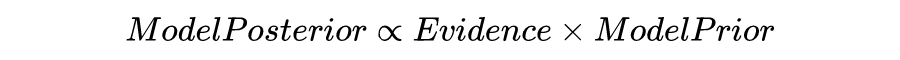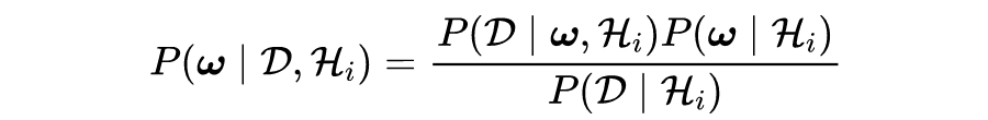 MacKay 在 1992 年公布的文章《Bayesian interpolation》展示了贝叶斯框架如何自然地处理模型设计和通用统计模型比较的任务。在该工作中,描述了两个层次的推理:拟合模型的推理和评估模型适用性的推理。第一层推理是贝叶斯规则用于模型参数更新的典型应用。如下公式