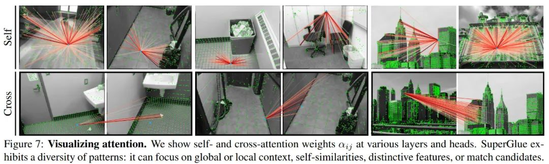 下图展示了每层self-attention以及across-attention中权重 的结果。按照特征匹配从难到易,文中画出了3个不同的特征点作为演示,绿色特征点(容易),蓝色特征点(中等)以及红色特征点(困难)。对于self-attention,初始时它(某个特征)关联了图像上所有的点(首行),然后逐渐地关注在与该特征相邻近的特征点(尾行)。同样地,cross-attention主要关注去匹配可能的特征点,随着层的增加,它逐渐减少匹配点集直到收敛。绿色特征点在第9层就已经趋近收敛,而红色特征直到最后才能趋紧收敛(匹配)。可以看到无论是self还是cross,它们关注的区域都会随着网络层深度的增加而逐渐缩小。