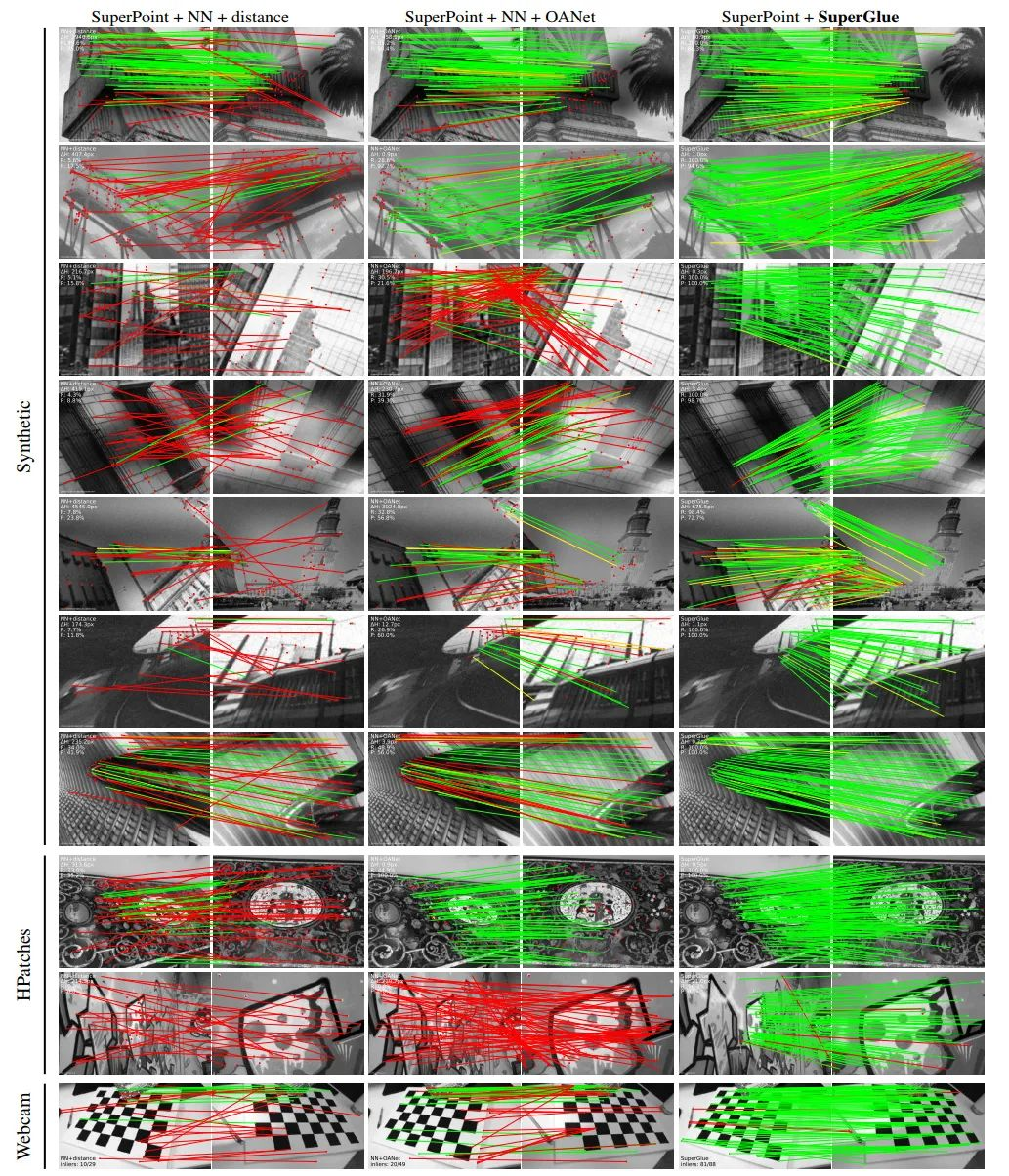第一列是SuperPoint+暴力匹配结果,第二列是SuperPoint+OAnet(ICCV 2019)结果,第三列是SuperPoint+SuperGlue结果。能看到SuperGlue惊人的特征匹配能力,尤其是在大视角变化时优势明显(红线表示错误匹配,绿线表示正确匹配)。