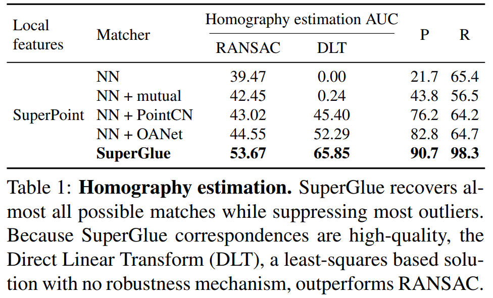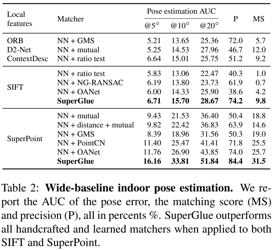 特征匹配的目的是为了解算出两帧之间的相对位姿,所以实验对比的一个指标就是单应矩阵估计,另外还有室内外的位姿估计。只能说SuperGlue的效果太好了,直接放结果吧(本来论文7页就写完了,作者放了10页附录大招)。