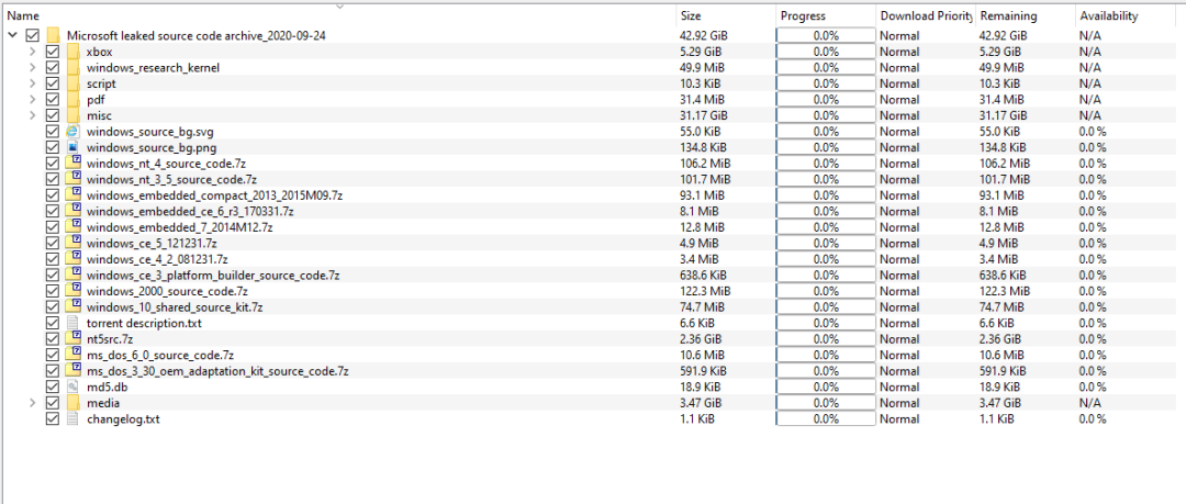 已下载泄露文件的用户提供了如下截图,可以看到整个文件大小为 42.92GB,从目录结构来看,被泄露的内容还包括 Xbox 操作系统源码,以及 Windows NT 5 内核、Windows NT 4 内核和 Windows NT 3.5 内核源码,此外还有 Windows 2000 等其他版本操作系统的源码,其中名为"misc"的文件夹体积最大,总共 31.17GB,占到了整个文件的 70%。