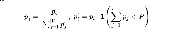 Nucleus采样:也是只考虑前若干个概率最大的词,不过以一种概率累计式的方法,即,