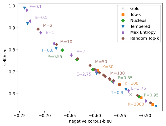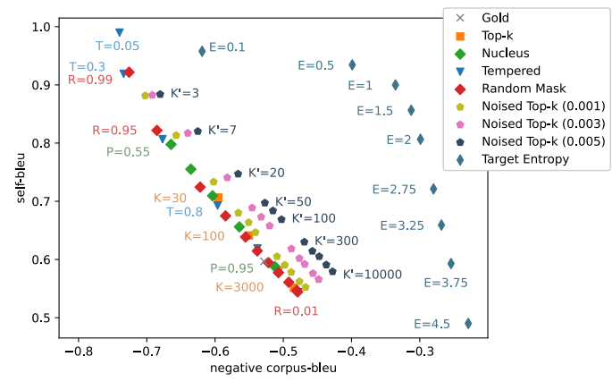 本文针对当前主流的几种采样算法进行了系统性的比较,观察它们的Q (Quality)-D (Diversity)平衡,其中质量由BLEU衡量,多样性由n-gram entropy衡量。