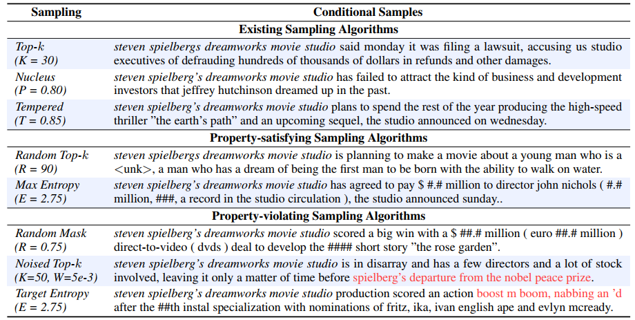 本文在语言模型上比较了当前主流的几个采样算法Top-K, Nucleus, Tempered,发现他们都满足三个关键性质,因此在效果上难分伯仲。