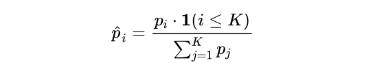 Top-k采样: 只考虑前 个概率最大的词,注意要把它们的概率重新归一化,即